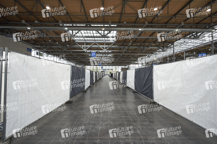 Zeltdörfer-Unterkünfte für ukrainische Kriegsflüchtlinge in der Halle 27 auf dem Messegelände, inklusive Wasch- und Duschmöglichkeiten, errichtet von der Feuerwehr Hannover. Die spätere Versorgung erfolgt durch das DRK. Hannover, 06.03.2022