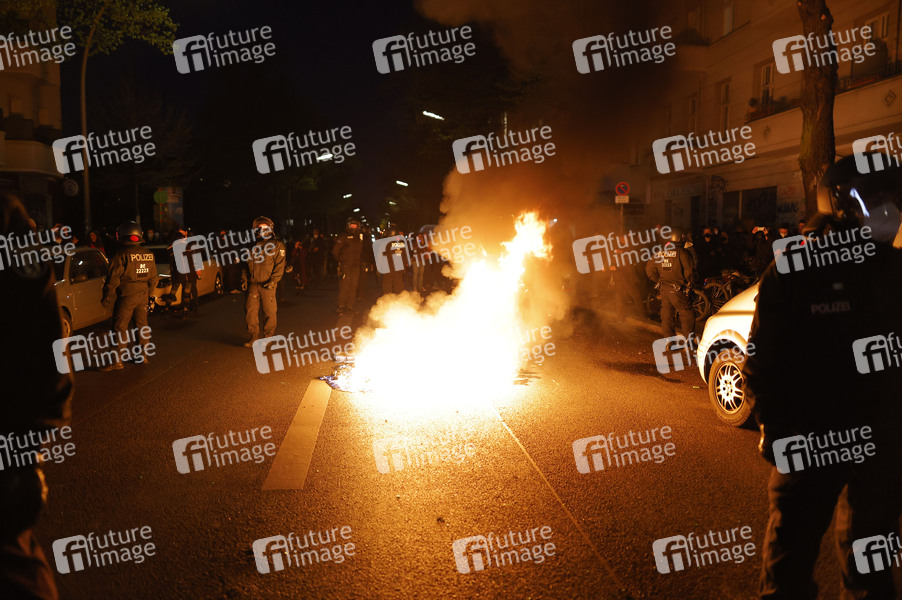 Revolutionäre 1. Mai Demonstration in Neukölln. Bei bei der linksradikalen 1.-Mai-Demo am Abend kommt es zu Ausschreitungen. Demonstranten attackieren Polizisten mit Steinen, Flaschen und Böllern, mehrere Beamte werden verletzt, es kommt zu 240 Festnahmen. Berlin, 01.05.2021