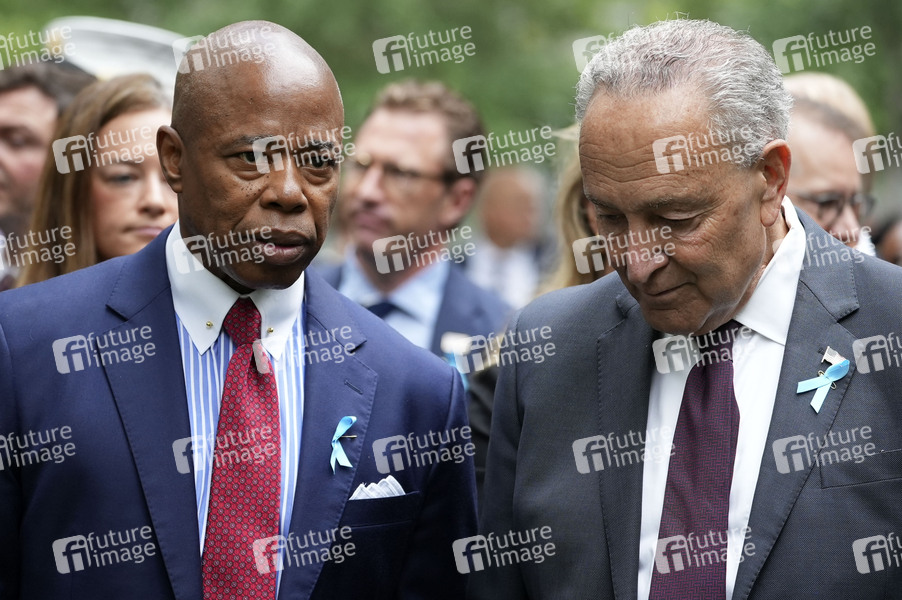 Eric Adams und Chuck Schumer bei der Gedenkfeier für die Opfer der Terroranschläge vor 21 Jahren am 9/11 Memorial. Mit Schweigeminuten und der Verlesung der Namen der fast 3000 Todesopfer haben die USA am Sonntag an die Terroranschläge vom 11. September 2001 erinnert. Am früheren Standort des World Trade Centers in New York verlasen Angehörige wie jedes Jahr am 11. September die Namen aller Anschlagsopfer. New York, 11.09.2022