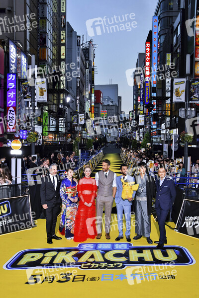 Rob Letterman, Marie Iitoyo, Kathryn Newton, Ryan Reynolds, Justice Smith, Ryoma Takeuchi und Ken Watanabe bei der Weltpremiere des Kinofilms 'Pokémon Detective Pikachu / Pokémon Meisterdetektiv Pikachu' in Kabukicho. Tokio, 24.04.2019
