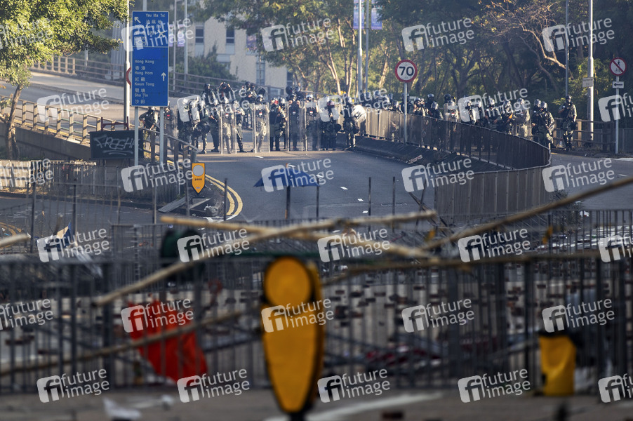 Polizei - Belagerung an der Polytechnischen Universität. Die Polizei umstellt den Campus der Universität, nachdem Demonstranten den Cross-Harbor-Tunnel und die Hauptstraße außerhalb des Campus blockiert haben. Hongkong protestiert seit fünf Monaten ununterbrochen. Am Montag, dem 11. November 2019, begann ein Streik in der ganzen Stadt, der Teile von Hongkong zum Erliegen brachte, als MTR-Stationen geschlossen und mehrere Straßensperren errichtet wurden. Hongkong, 18.11.2019