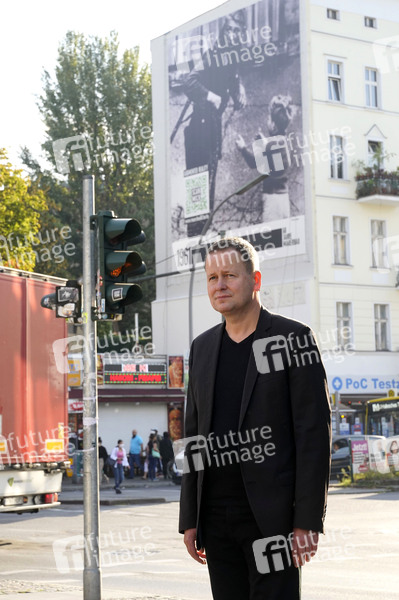 Klaus Lederer bei der Installation eines Großfotos zum 60. Jahrestag des Mauerbaus von Kulturprojekte Berlin und der Stiftung Berliner Mauer am Hermannplatz. Berlin, 13.08.2021