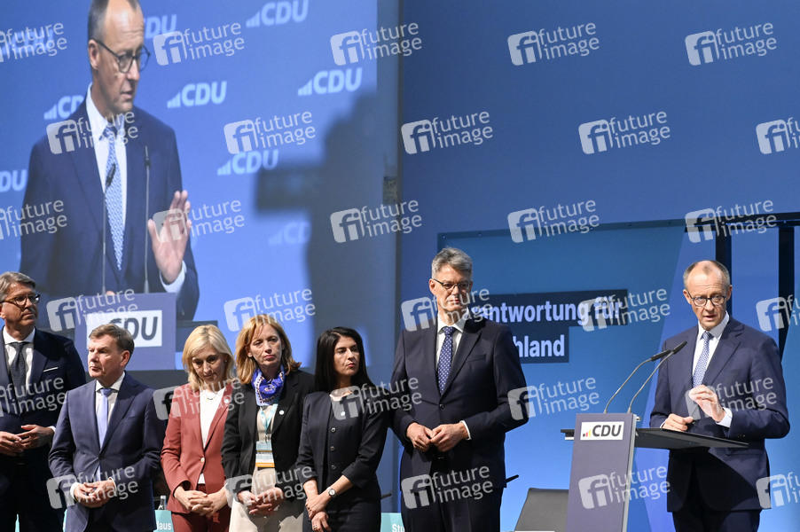 Wolfram Weimer, Johann David Wadephul, Nina Warken, Karin Prien, Serap Güler, Patrick Schnieder und Friedrich Merz bei der Tagung vom Bundesausschuss der CDU Deutschlands im Estrel Berlin. Berlin, 28.04.2025