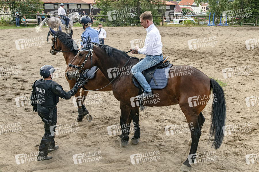 Sylke Schneider und Michael Kretschmer auf dem Pferd Rübezahl beim Besuch der Polizeireiterstaffel in Großerkmannsdorf. Radeberg, 23.07.2020