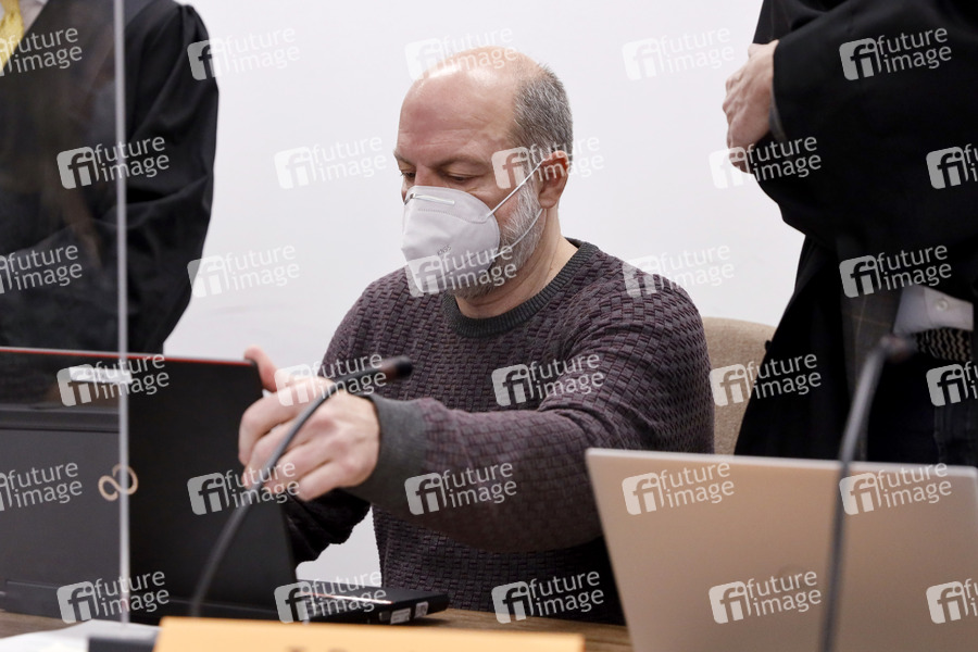 Der Angeklagte Thomas Drach bei seinem Strafprozess vor dem Kölner Landgericht. Der 61-jährige frühere Reemtsma-Entführer soll vier Geldtransporter in Köln, Frankfurt am Main und Limburg überfallen haben. Die Anklage lautet unter anderem auf versuchten Mord und besonders schweren Raub. Der Prozess findet unter aufwendigen Sicherheitsvorkehrungen statt. Köln, 07.02.2022