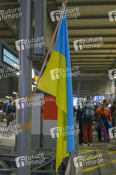 Bahn, Bahnhof, Ukraine, Russland, Ukrainekonflikt, Politik, Krise, Konflikt, Einmarsch, Angriff, Krieg, Invasion, internationale Krise, Fliehen, Flucht, Flüchtlinge, Flüchtling, Flüchtlingswelle, Freiwillige, Helfer, Helferinnen, Hilfe, Hilfsbereitschaft, Kriegsflüchtling, Ukrainer, Kriegsopfer, Fahne
