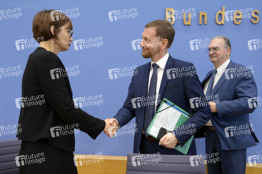 Bettina Stark-Watzinger, Michael Kretschmer und Reiner Haseloff bei der Bundespressekonferenz zur Entscheidung zur Gründung von zwei Großforschungszentren in der Lausitz und im mitteldeutschen Revier im Haus der Bundespressekonferenz. Berlin, 29.09.2022