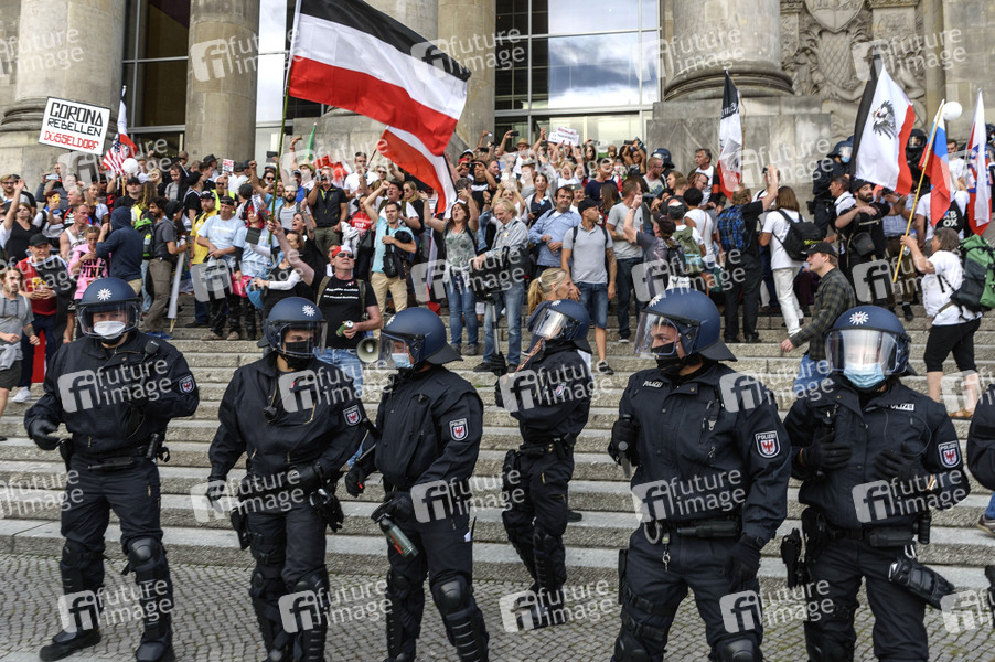 Coronaleugner, Verschwörungstheoretiker und rechte Gruppen der Initiative Querdenken protestieren mit einer Großdemonstration gegen die bestehenden Maßnahmen zur Eindämmung der Corona-Pandemie. Vornehmlich Reichsbürger versuchten im Anschluss an die Abschlusskungebung des Reichstagsgebäude zu stürmen. Es kam zu Auseinandersetzungen mit den eingesetzten Sicherheitskräften. Wegen Nichteinhaltung der polizeilichen Auflagen wurde die Demonstration durch die Polizei beendet. Berlin, 29.08.2020