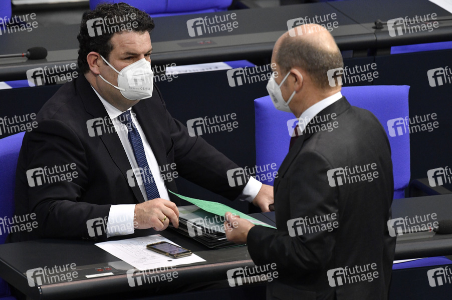 Hubertus Heil und Olaf Scholz in der 206. Sitzung des Deutschen Bundestages im Reichstagsgebäude. Berlin, 28.01.2021