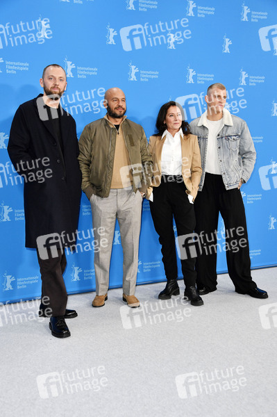 Gustav Möller, Dar Salim, Sidse Babett Knudsen und Sebastian Bull beim Photocall zum Kinofilm 'Vogter / Sons' auf der Berlinale 2024 / 74. Internationale Filmfestspiele Berlin im Hotel Grand Hyatt. Berlin, 22.02.2024
