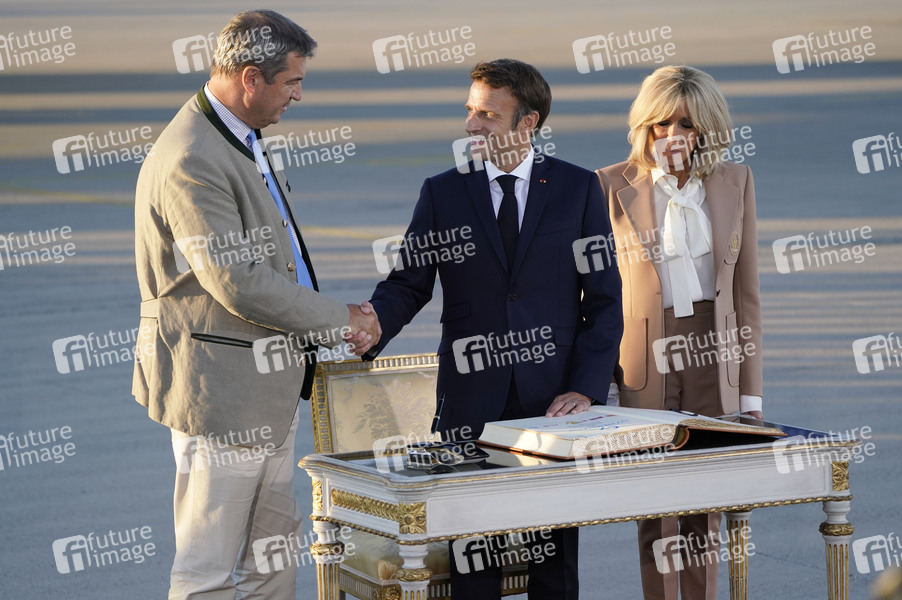 Markus Söder und Emmanuel Macron mit Ehefrau Brigitte Macron bei der Ankunft von Präsident Macron zum G7-Gipfel am Flughafen München Franz Josef Strauß. München, 25.06.2022