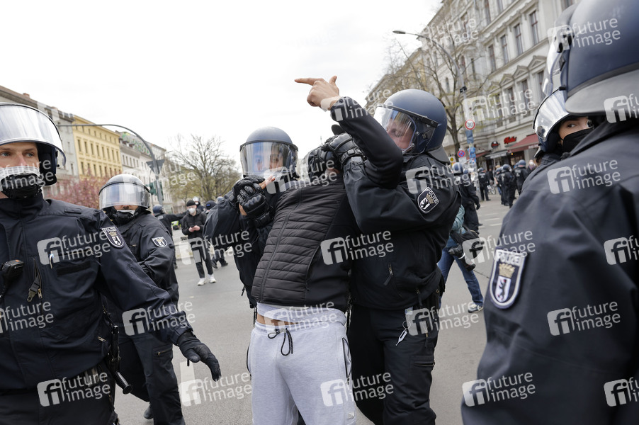 Demonstration in Kreuzberg unter dem Motto 'Generation miteinander - Herzensangelegenheit' aus dem Kreis der Querdenker-Bewegung. Am Rande der Demo kam es zu zahlreichen Gegenprotesten. Berlin, 24.04.2021