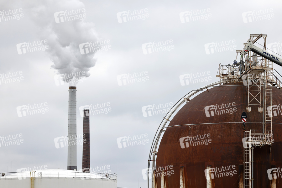Schornstein und Gastank von Shell bei der Eröffnung der Baustelle für Deutschlands größte Anlage zur Herstellung von Bio-Flüssiggas auf dem Gelände des 'Shell Energy an Chemicals Park Rheinland'. Köln, 09.02.2022