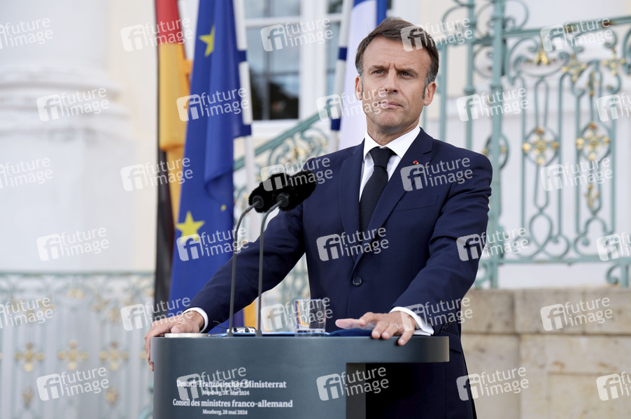Emmanuel Macron beim Treffen des Deutsch-Französischen Ministerrats im Gästehaus der Bundesregierung Schloss Meseberg. Meseberg, 28.05.2024