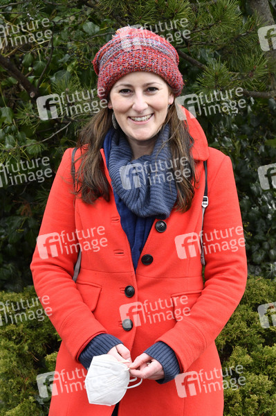 Janine Wissler beim stillen Gedenken an Karl Liebknecht und Rosa Luxemburg an der Gedenkstätte der Sozialisten auf dem Städtischen Zentralfriedhof Friedrichsfelde. Berlin, 14.03.2021