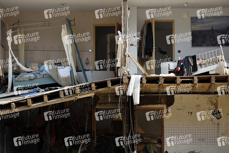 Nach dem Jahrhunderthochwasser in der Eifel durch heftige Regenfälle und Dauerregen mit Überschwemmungen und Überflutungen haben die Aufräumarbeiten im Ahrtal begonnen. Einheiten von Polizei, THW, Bundeswehr und Feuerwehr mitsamt vielen freiwilligen Helfern räumen Straßen, entfernen Schutt und Schlamm und versorgen die Menschen. Im Bild zerstörte Häuser an der Uferpromenade in der Ortschaft Dernau, in der die Flut viele Häuser zerstörte, 22.07.2021
