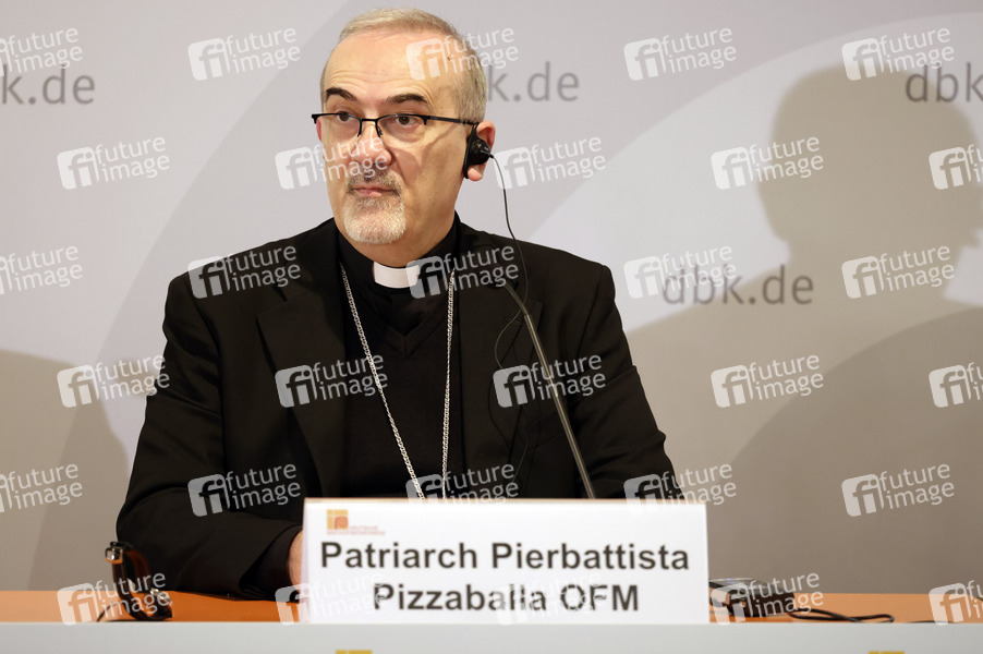Prominenz, Pressekonferenz, PK, Versammlung, Treffen, Deutsche Bischofskonferenz, DBK, Zusammenschluss der römisch-katholischen Bischöfe aller Diözesen in Deutschland, Katholische Kirche, Glaube, Religion, Kleriker, Theologe, Kardinal, OFM, Lateinischer Patriarch von Jerusalem, Italienischer Erzbischof