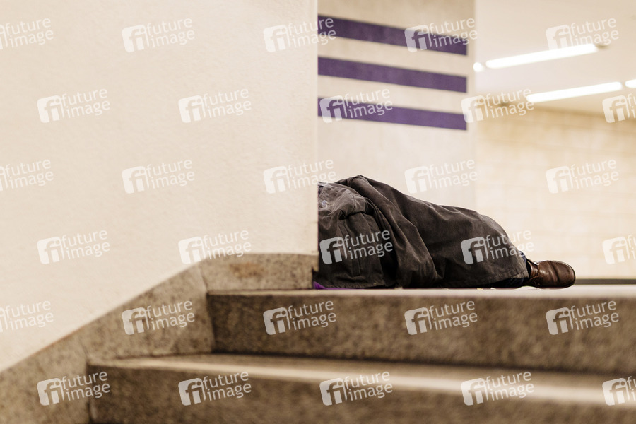 Ein Obdachloser schläft improvisiert einer Decke in einer U-Bahn-Haltestelle. Köln, 04.12.2019