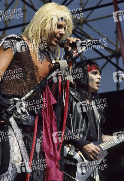 Vince Neil und Mick Mars von Mötley Crüe auf dem Monsters of Rock Festival 1984 im Donington Park. Donington, 18.08.1984