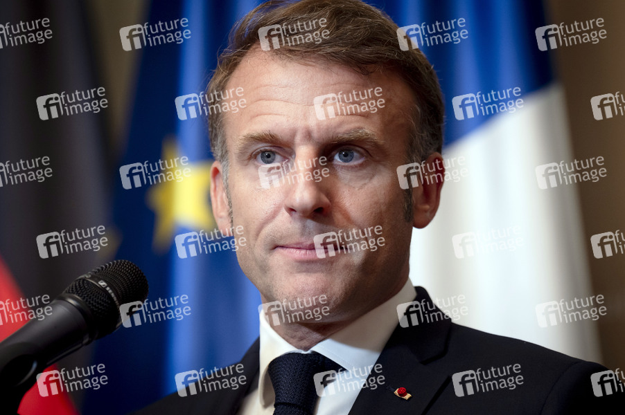 Emmanuel Macron beim Empfang des französischen Staatspräsidenten zu einem gemeinsamen Gespräch mit dem Bundeskanzler mit anschließendem Pressestatement in der Borsig-Villa am Tegeler See. Berlin, 23.07.2025