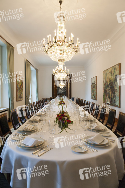 seit 1950 Amts- und Wohnsitz des Bundespräsidenten der Bundesrepublik Deutschland, seit 1994 Zweitwohnsitz, Regierungsgebäude, Bauwerk, Tisch, Teller, Gedeck, Geschirr, Besteck