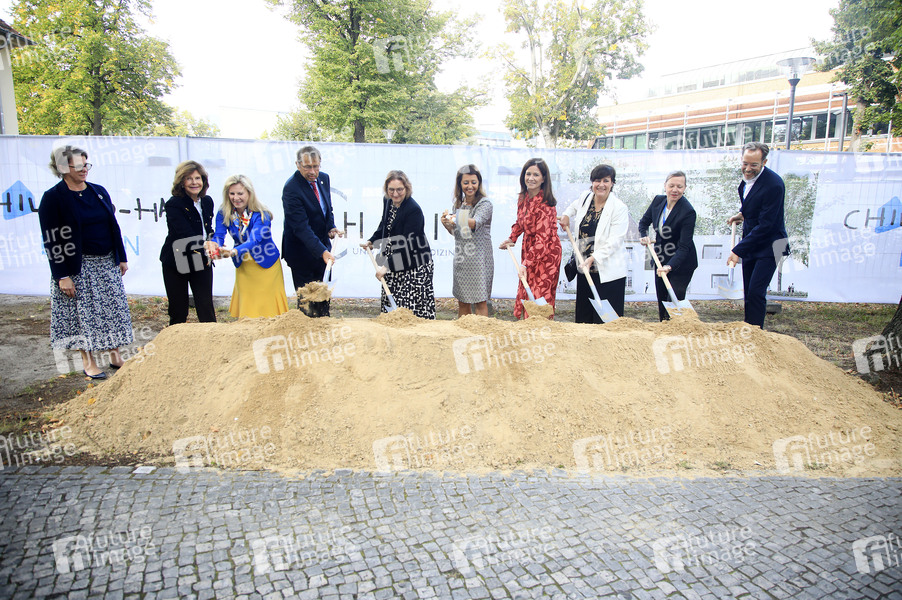 Julia Woeste, Silvia von Schweden, Astrid Lurati, Heyo K. Kroemer, Sibylle M. Winter, Felor Badenberg, Katharina Günther-Wünsch, Franziska Becker, Pia Maier Schriever und Matthias Schmidt beim feierlichen Spatenstich zum Childhood-Haus Berlin an der Charité. Berlin, 19.09.2024