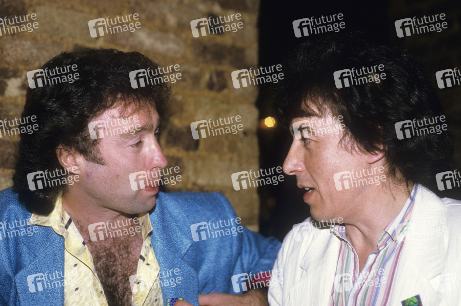 Paul Rodgers und Bill Wyman von Willie and the Poor Boys bei einem Pressetermin. London, 18.04.1985