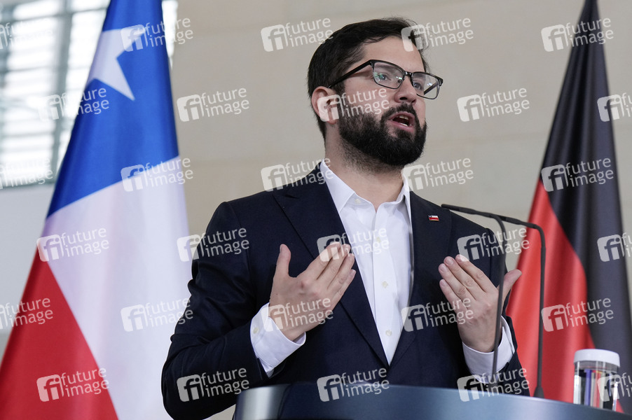 Gabriel Boric beim Empfang des Präsidenten von Chile mit militärischen Ehren und zu einem gemeinsamen Gespräch mit dem Bundeskanzler mit anschließendem Pressestatement im Bundeskanzleramt. Berlin, 10.06.2024