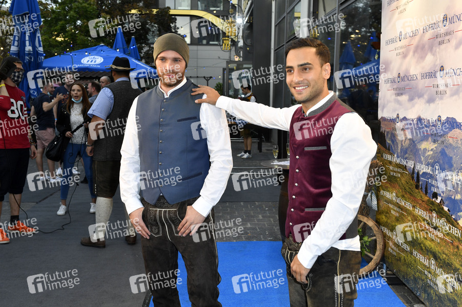 Patrick Heinrich und Timur Ülker beim Fassanstich bei der 9. Hofbräu Berlin Wiesn im Hofbräu Wirtshaus Berlin. Berlin, 19.09.2020