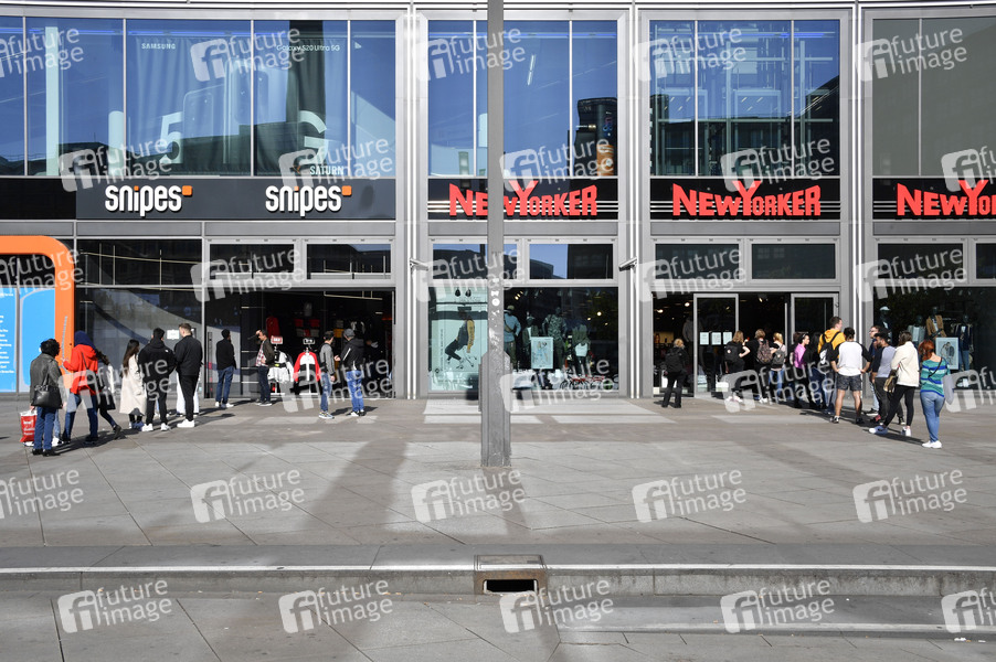 Die ersten Läden am Alexanderplatz haben nach der Corona-Zwangspause wieder geöffnet. Nur mit dem Mindestabstand scheint es noch nicht so richtig zu klappen. Berlin, 22.04.2020