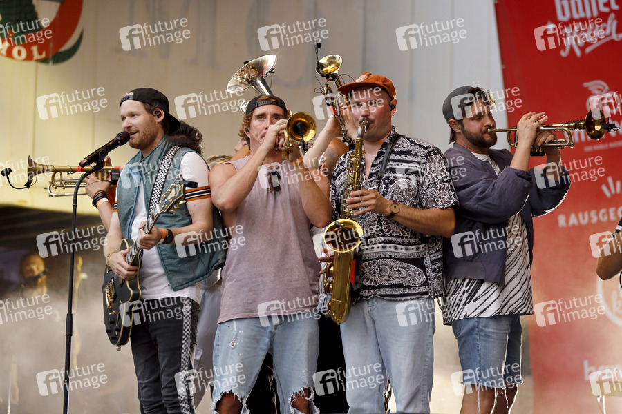 Jojo Berger mit der Band Querbeat, einer 13-köpfigen Brasspop-Band aus Bonn, beim Benefizkonzert für die Opfer der Flutkatastrophe an der Südbrücke. Köln, 12.08.2021