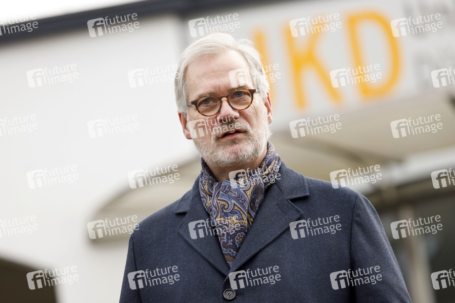 Professor Dr. Dr. Frank Schneider bei einem Pressestatement vor dem Universitätsklinikum Düsseldorf. In Rekordzeit hat das UKD eine räumlich vollständig getrennte Neubau-Einheit zur Versorgung von COVID-19-Patienten erbaut. Das Gebäude bietet 18 Intermediate-Care-Plätze und 25 Intensivplätze. Damit verfügt das Universitätsklinikum über eine der modernsten Intensiveinheiten Europas. Düsseldorf, 30.12.2020