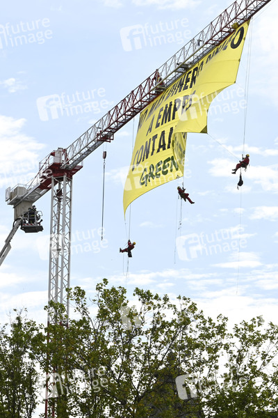 Greenpeace, Demonstration, Protest, Aktion, Banner, Politik, Unweltschutz, Umweltschützer, Aktivisten, Kletterer