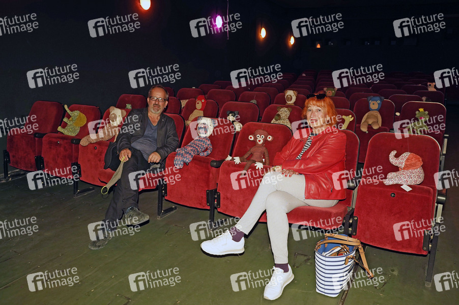 Christos Acrivulis und Zazie de Paris bei der Wiedereröffnung des Programmkinos 'Klick' in Charlottenburg nach dem Lockdown wegen der Corona-Epidemie. Statt der 83 Plätze dürfen bei Einhaltung der Abstandsregeln nur 18 Plätze belegt werden. Die Eintrittspreise sind gleich geblieben. Die Kuscheltiere stellt eine benachbarte Designerin in der Windscheidstraße zur Verfügung, die bei ihr auch gekauft werden können.Berlin, 02.07.2020