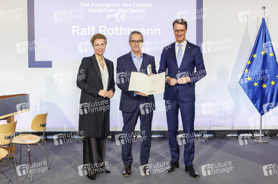 Ina Brandes, Ralf Rothmann und Hendrik Wüst bei der Verleihung des Kunstpreises des Landes Nordrhein-Westfalen 2025 an Ralf Rothmann. Düsseldorf, 17.11.2025
