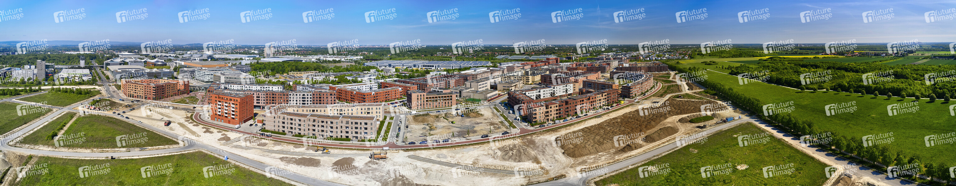 Bau, Baustelle, Wohnegebiet, Bebauung, Interessengemeinschaft Kronsrode Mitte, sechs Wohnungsbauunternehmen, Wphnungen, Reihenhäuser, Gewerbeflächen, Wohnungsbauprojekt, Luftaufnahme, Luftbild, Drohne, Drohnenaufnahme, Rosalind-Franklin-Allee, Panorama