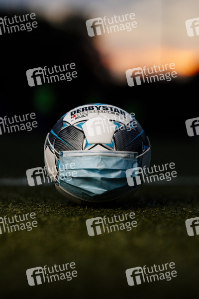 Der offizielle Spielball der Bundesliga Derbystar liegt mit Mundschutz auf einem Fußballplatz. Königsdorf, 02.09.2020