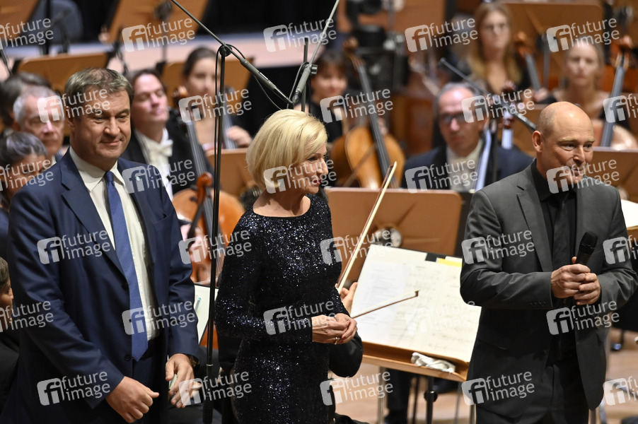 Markus Söder, Julia Lehner und Jens-Daniel Herzog beim 2. Philharmonischen Konzert zum 100. Geburtstag der Staatsphilharmonie Nürnberg in der Meistersingerhalle. Nürnberg, 15.10.2022