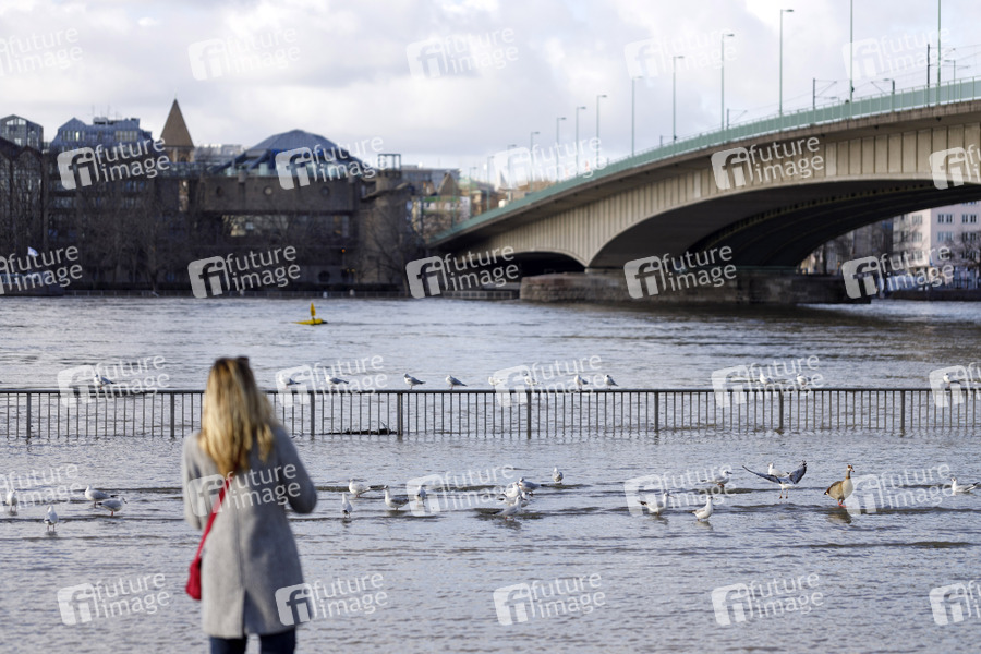 Rheinpegel, Fluss, Rhein, Pegelstand, Pegel, Hochwasser, Pegelmarke, Hochwassermarke, Hochwasserwelle, Scheitelpunkt, Rhein-Pegel, Flussbett, Flut, Schifffahrt, Hochwasserschutz, Wasserstand, Mittelwasser, Tauwetter, Rheinschifffahrt, Rheinufer, Rhein-Ufer, Hochwasserschutzzentrale, Hochwasserwelle, Pegel-Nullpunkt, Hochwasserlage, Hochwassermeldedienst, Hochwasserinformationsdienst, Wasserstände, Pegelstände, Wetterlage, ansteigendes Wasser, steigender Pegel, unter Wasser, überflutet, Rheinufer, Schmelzwasser, Wetter, Scheitelpunkt, kritische Marke, Hochwassermarke, Rodenkirchen, Symbolbild, Symbolfoto