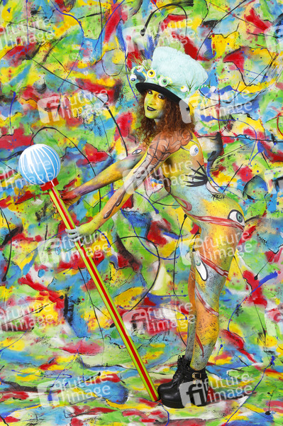 Das World Bodypaiting Festival 2020 fand aufgrund der Corona-Pandemie online statt. Unter dem vorgegebenen Motto 'Psychedelic Circus' verwandelte BodyArt-Künstler Jörg Düsterwald sein Model Lena in einen psychedelischen Mad Hatter. Hameln, 10.07.2020