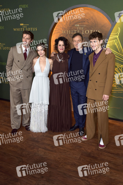 Patrick Schwarzenegger, Sarah Catherine Hook, Parker Posey, Jason Isaacs und Sam Nivola bei der Premiere der 3. Staffel der HBO Serie 'The White Lotus' im Paramount Theater. Los Angeles, 10.02.2025