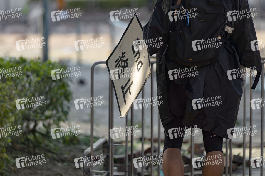 Pro-demokratischer Protestierender hält der Polizei ein ein Verkehrsschild entgegen