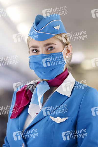 Stewardess von Eurowings bei der Vorstellung des Sicherheitskonzepts am Flughafen Köln Bonn während der Coronakrise 'Sicher in Corona Zeiten'. Köln, 27.05.2020