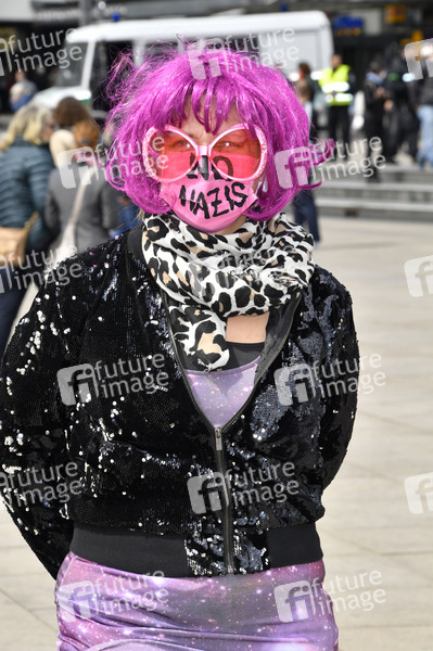 Demonstrantin Rosa Rave vom Bündnis 'Reclaim Club Culture' bei einer 'Corona' Demonstration am Alexanderplatz. Am Samstag sind rund um den Rosa-Luxemburg-Platz mehrere 'Hygienedemos' und Gegenproteste geplant. Am Alexanderplatz sollen ab 14 Uhr insgesamt zehn Kundgebungen starten. Berlin, 16.05.2020