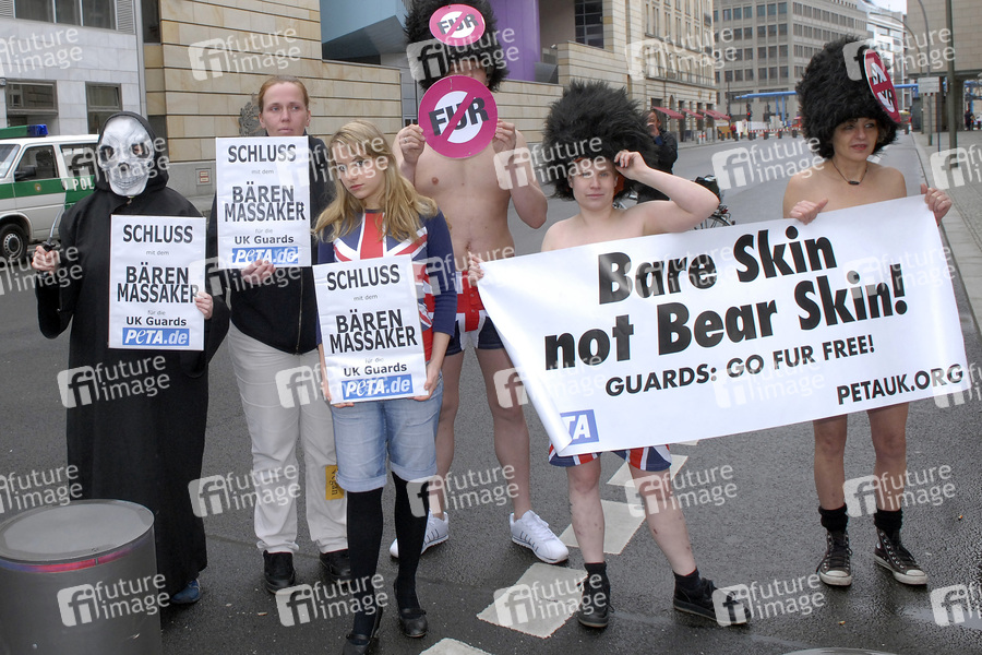 Demonstarion von Tierrechtlern vor der Britischen Botschaft in Berlin. PeTA Deutschland e.V. appelliert an die Queen Schluss mit dem Bärenfellmassaker für die Palastwache zu machen.
