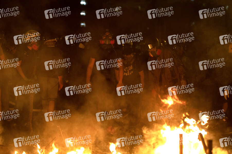 Studenten an der Feuerbarrikade - Kampf an der Chinese University Hong Kong (CUHK). Hongkong protestiert seit fünf Monaten ununterbrochen. Am Montag, dem 11. November 2019, begann ein Streik in der ganzen Stadt, der Teile von Hongkong zum Erliegen brachte, als MTR-Stationen geschlossen und mehrere Straßensperren errichtet wurden. Hongkong, 12.11.2019