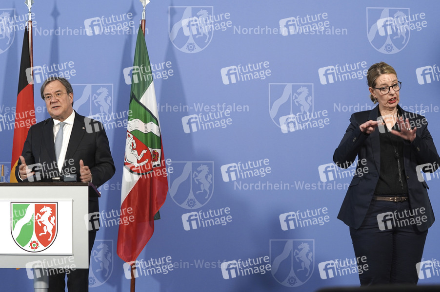 Politiker, CDU, Ministerpräsident von Nordrhein-Westfalen, Forschung, Studie, Heinsberg, PK, Pressekonferenz, Forschungsstudie, Wissenschaft, Presse-Briefing, Statement, Politik, aktuelle Lage, NRW, Rede, Statement, Corona, Sars-CoV-2, Covid-19, Coronavirus, Coronaviren, Corona-Virus, Coronakrise, Corona-Krise, Coronamaßnahmen, Corona-Schutz, flatten the curve, Ausnahmesituation, Zeitgeschichte, Gebärdensprache
