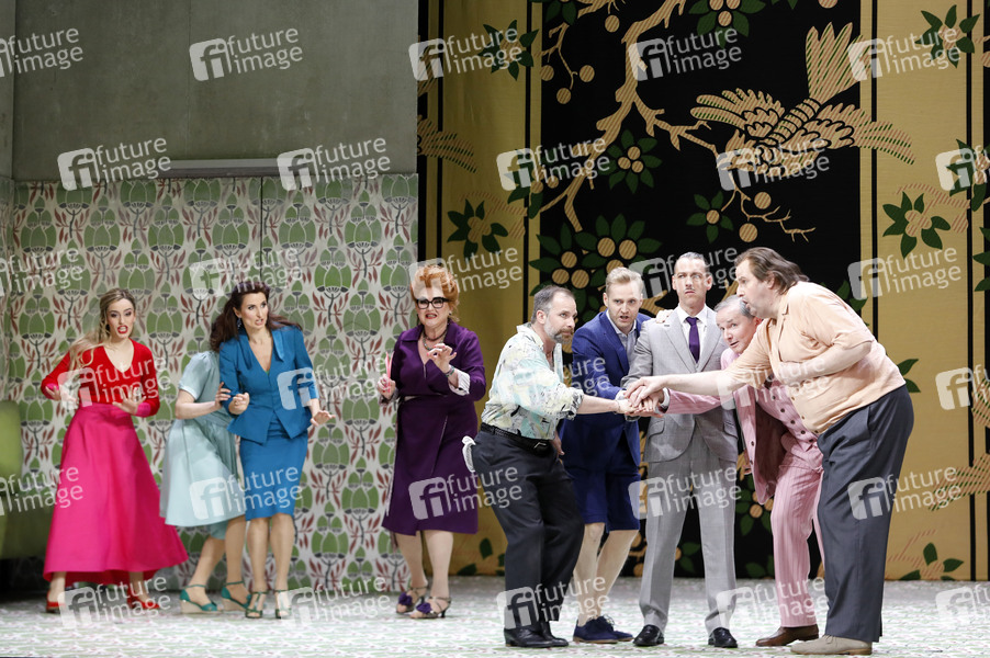 Ruzan Mantashyan, Alma Sade, Karolina Gumas, Agnes Zwierko, James Kryshak, Oleksiy Palchykov, Günter Papendell, Ivan Tursic und Jens Larsen bei der Fotoprobe zur Oper 'Falstaff' von Giuseppe Verdi in der Komischen Oper. Berlin, 27.04.2022