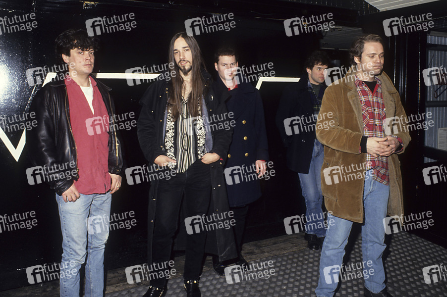Paul Langlois, Rob Baker, Johnny Fay, Gord Sinclair und Gord Downie von The Tragically Hip bei einem Photoshooting im Kaiserkeller. Hamburg, 10.08.1990