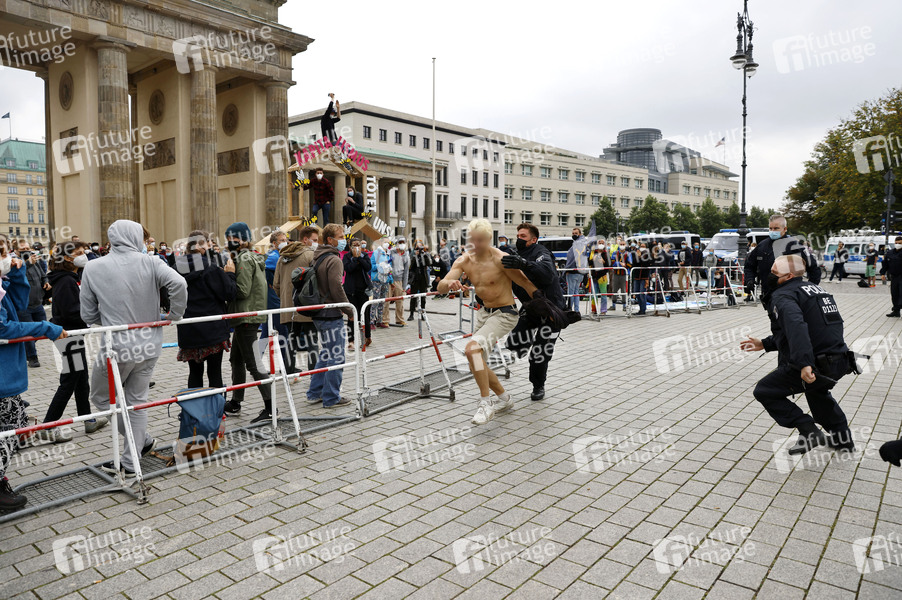 Im Rahmen einer Aktionswoche haben Klimaschutz-Aktivisten den Platz am Brandenburger Tor blockiert. Am frühen Morgen kletterten zudem mehrere Personen auf das Brandenburger Tor. Berlin, 20.08.2021